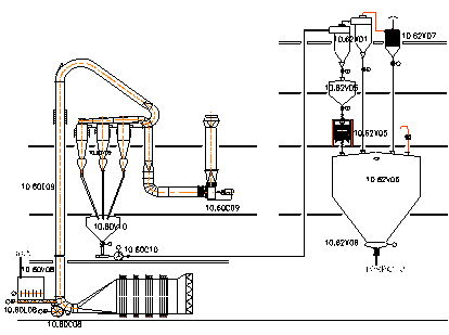 ⑵ 離心風機負壓吸送是稀相輸送,主要是設計好輸送風量、固氣比、風壓、輸送管道直徑、卸料旋風分離器。輸送量為16.67t/h,風速為35m/s,物料密度為0.1%。