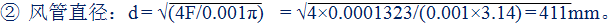 ③ 風量:Q1 = F1×L = F1×vt = πd²vt/4 = 3.14×0.411×0.411×35×3600/4 = 16708m³/h。