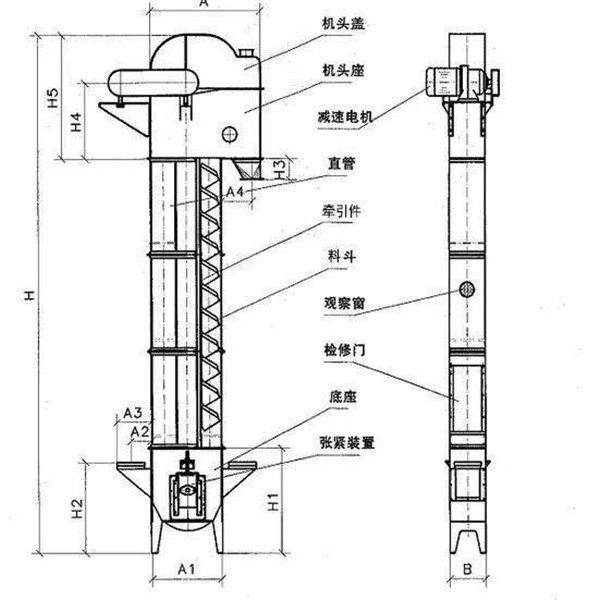 斗式提升機由料斗、驅動裝置、頂部和底部滾筒 (或鏈輪)、膠帶 (或牽引鏈條)、張緊裝置和機殼等組成。