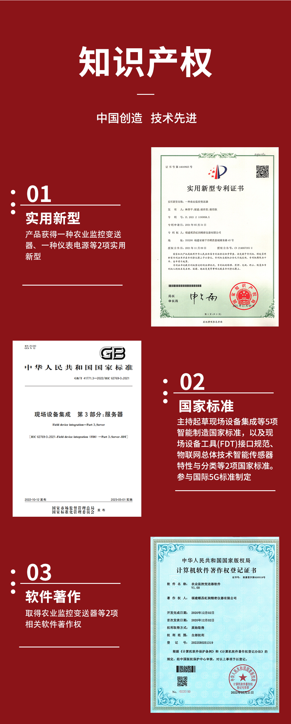 虹潤公司是專業(yè)生產(chǎn)環(huán)境監(jiān)測儀表的國家專精特新“小巨人”企業(yè)。生產(chǎn)的二氧化碳變送器,具有新型紅外檢定技術(shù),自動溫度補償,響應(yīng)靈敏,低功耗,模擬量變送輸出或RS485通訊等特點。產(chǎn)品獲得一種農(nóng)業(yè)監(jiān)控變送器、一種儀表電源等2項實用新型專利,主持起草現(xiàn)場設(shè)備集成等5項智能制造國家標準,以及現(xiàn)場設(shè)備工具(FDT)接口規(guī)范、物聯(lián)網(wǎng)總體技術(shù)智能傳感器特性與分類等2項國家標準,參與國際5G標準制定,取得農(nóng)業(yè)監(jiān)測變送器等3項相關(guān)軟件著作權(quán)。產(chǎn)品廣泛應(yīng)用于機房、配電站、地下車庫、工廠倉庫、食品儲存、養(yǎng)殖場、果蔬林園等環(huán)境場合對二氧化碳濃度的檢測。