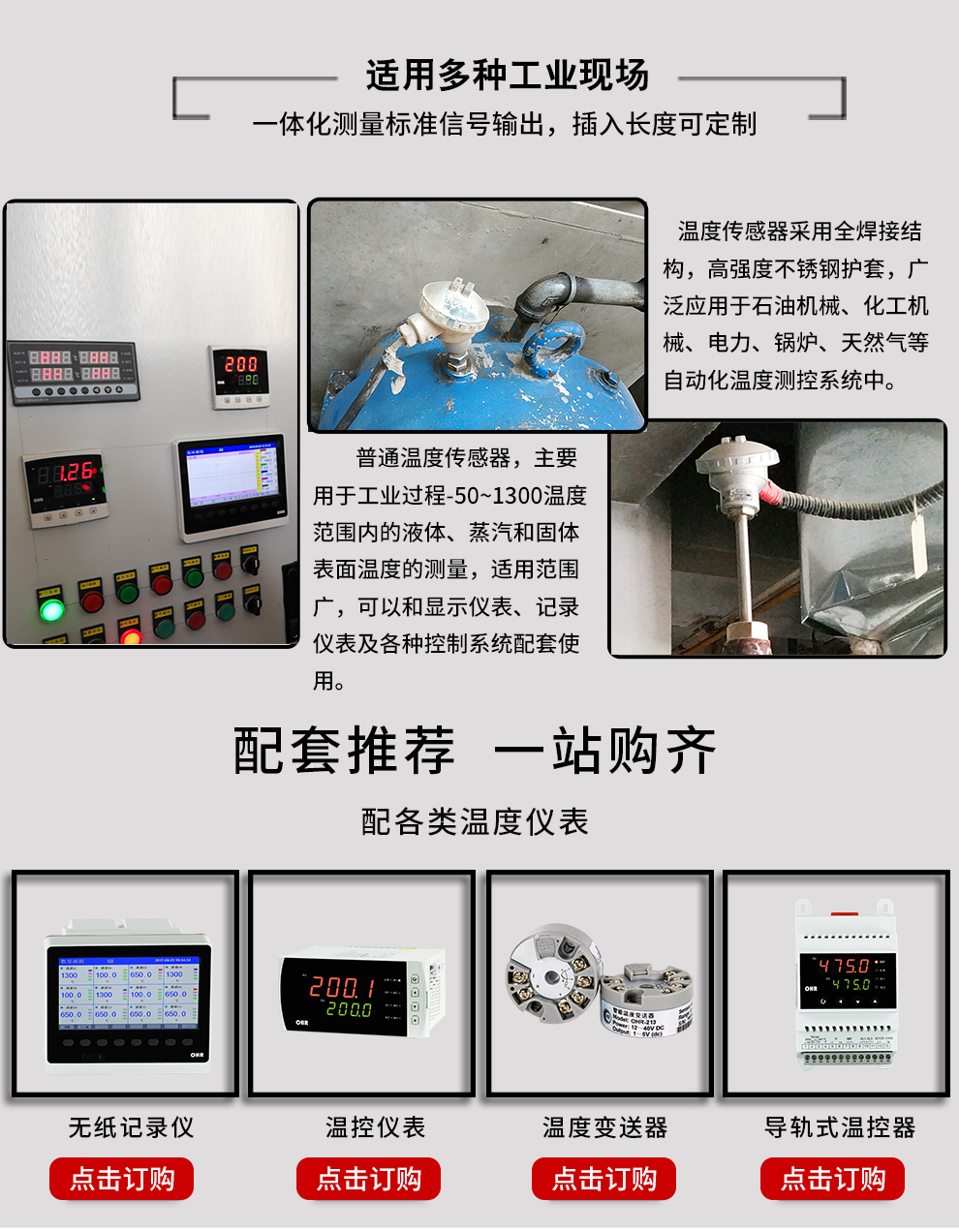 裝配式熱電阻熱電偶作為溫度測(cè)量傳感器,通常與溫度變送器、調(diào)節(jié)器及顯示儀表等配套使用,組成過程控制系統(tǒng),用以直接測(cè)量或控制各種生產(chǎn)過程中流體、蒸汽和氣體介質(zhì)以及固體表面等溫度。