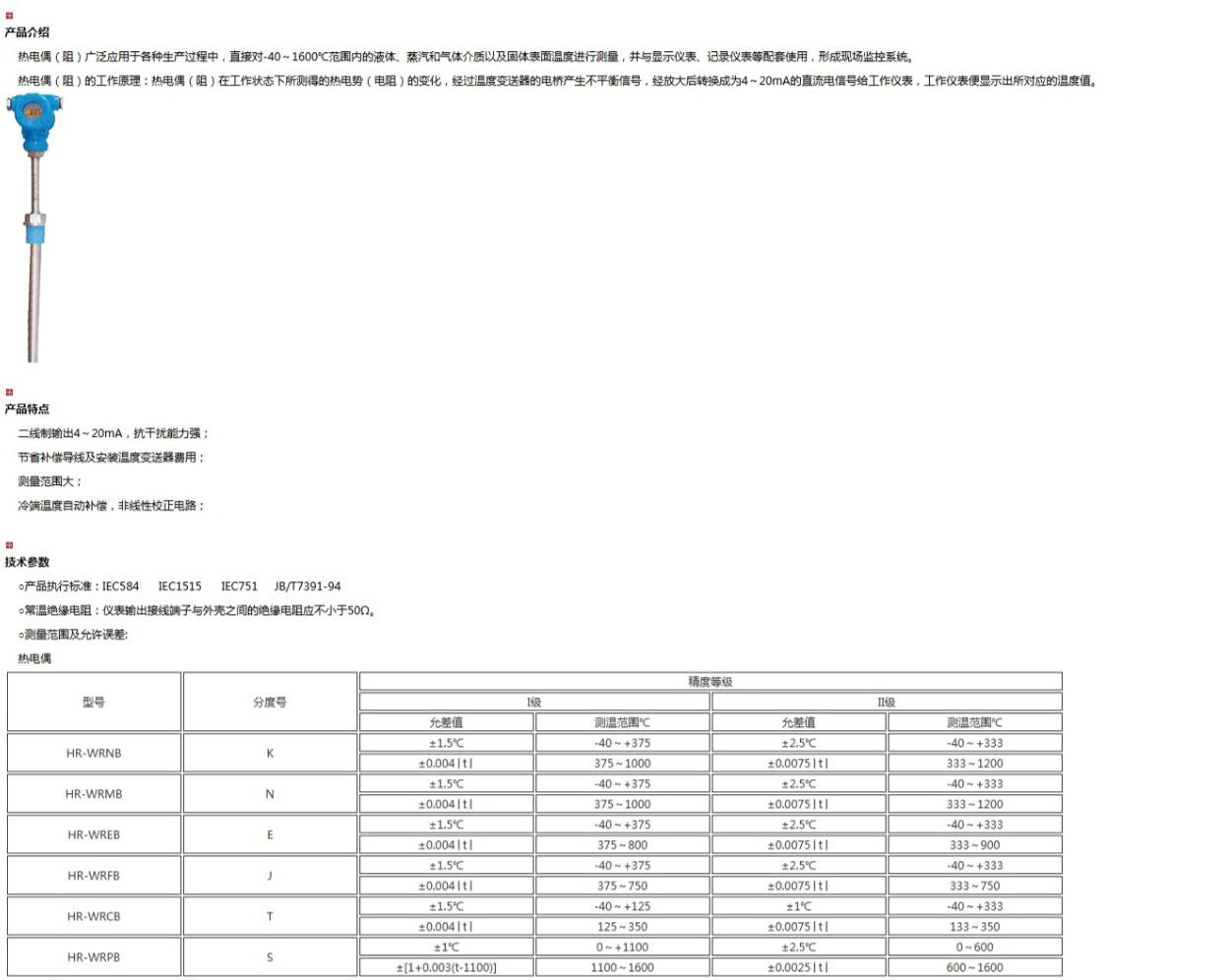 帶溫度變送器熱電偶(阻),由基準(zhǔn)源、冷端補償、放大單元、線性化處理、V/I轉(zhuǎn)換、斷偶處理、反接保護、限流保護等電路單元組成。它是將熱電偶(阻)產(chǎn)生的熱電勢經(jīng)冷端補償放大后,再帽由線性電路消除熱電勢與溫度的非線性誤差,最后放大轉(zhuǎn)換為4~20mA電流輸出信號。