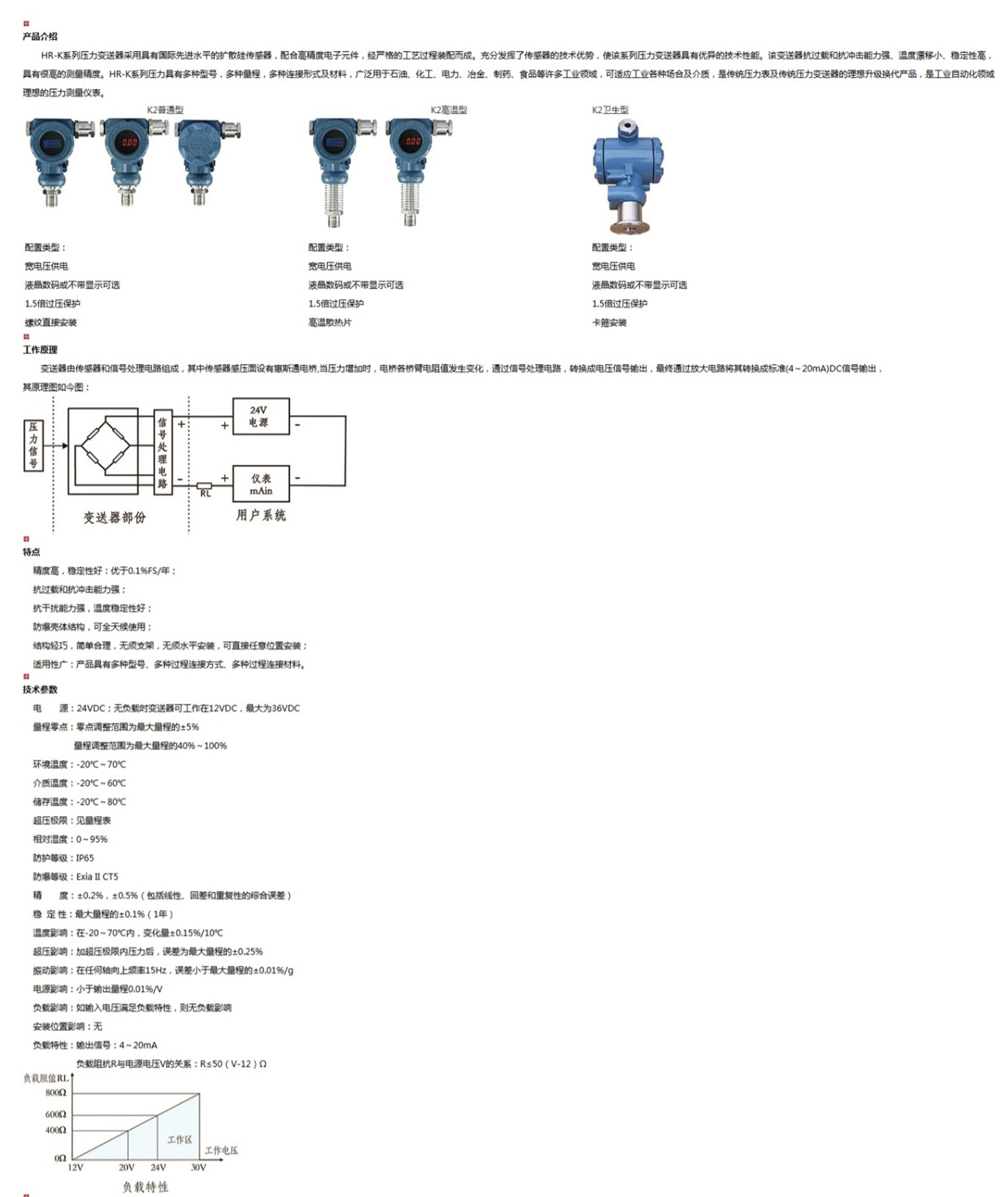 HR-K系列壓力變送器采用具有國際先進(jìn)水平的擴(kuò)散硅傳感器,配合高精度電子元件,經(jīng)嚴(yán)格的工藝過程裝配而成。充分發(fā)揮了傳感器的技術(shù)優(yōu)勢,使該系列壓力變送器具有優(yōu)異的技術(shù)性能。該變送器抗過載和抗沖擊能力強、溫度漂移小、穩(wěn)定性高,具有很高的測量精度。