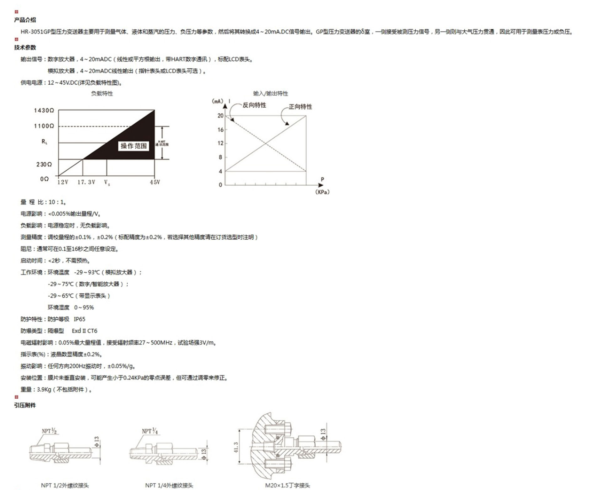 HR-3051GP型壓力變送器主要用于測量氣體、液體和蒸汽的壓力、負(fù)壓力等參數(shù),然后將其轉(zhuǎn)換成4~20mA.DC信號輸出。GP型壓力變送器的δ室,一側(cè)接受被測壓力信號,另一側(cè)則與大氣壓力貫通,因此可用于測量表壓力或負(fù)壓。