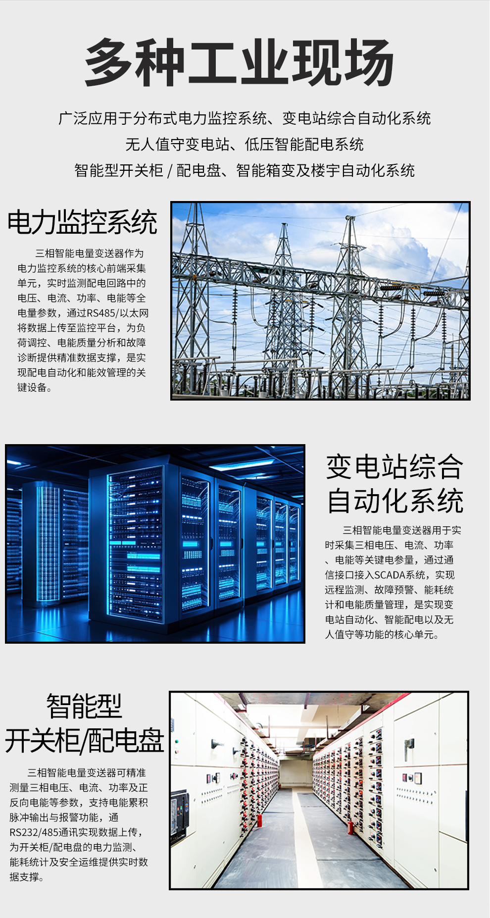 虹潤公司是專業(yè)生產(chǎn)電流傳感器的國家專精特新“小巨人”企業(yè)。生產(chǎn)的三相智能電量變送器,具有多種電參數(shù)測量,正反向電能累積,多種輸出信號,導(dǎo)軌壁掛共用, RS485/RS232通訊等特點(diǎn)。產(chǎn)品獲得基于一種交流信號變送器、交直流信號轉(zhuǎn)換電路、基于DCS技術(shù)的盤裝式三相電量表等3項(xiàng)國家發(fā)明專利,主持起草工業(yè)過程控制系統(tǒng)用模擬輸入兩位或多位輸出儀表國家標(biāo)準(zhǔn),直流漏電流傳感器規(guī)范、通信系統(tǒng)多通道數(shù)據(jù)采集控制終端規(guī)范等2項(xiàng)軍用標(biāo)準(zhǔn),以及現(xiàn)場設(shè)備集成等5項(xiàng)智能制造國家標(biāo)準(zhǔn),參與國際5G標(biāo)準(zhǔn)制定,取得液晶綜合電量集中顯示儀等2項(xiàng)相關(guān)軟件著作權(quán)。產(chǎn)品廣泛應(yīng)用于電力、冶金、化工、水泥、造紙、新能源、基礎(chǔ)設(shè)施等用電密集行業(yè)。